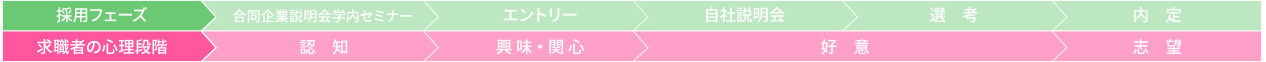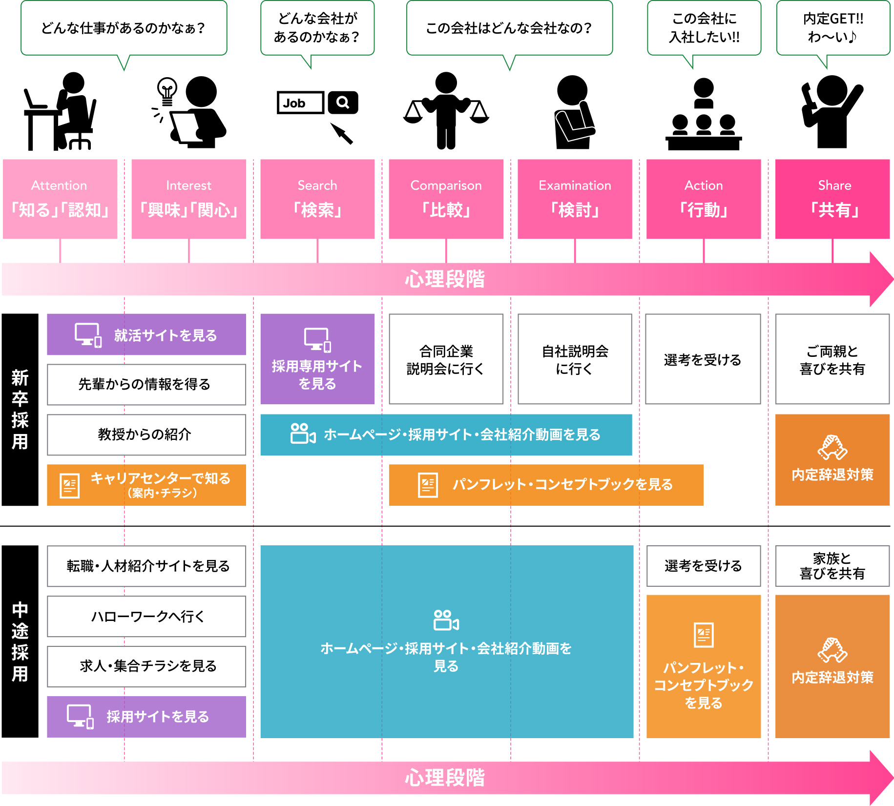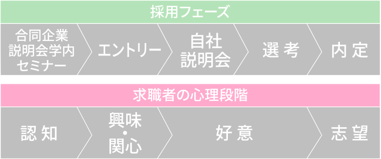 求職者の心理状況における、認知段階から内定段階まですべての段階で必要になりますので、採用マーケティングの根幹となります。